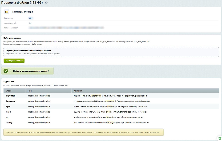 5. Что происходит с найденными нарушениями? Они сохраняются в таблицу базы данных с указанием источника (ссылка на элемент инфоблока или путь к файлу), контекста употребления и даты обнаружения. Вы можете менять их статус на «fixed» после добавления в белый список или правки контента.
