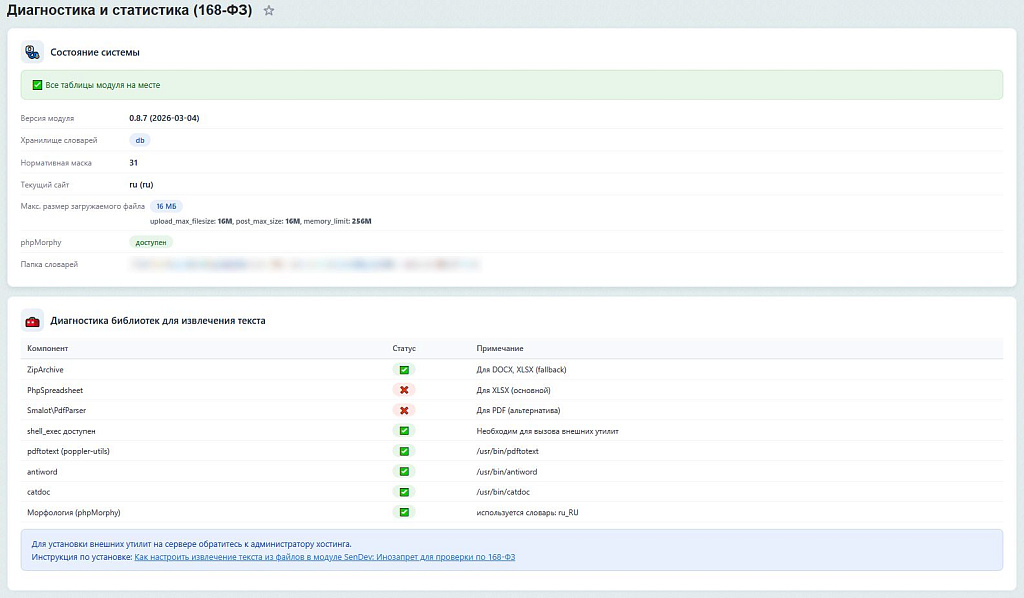 1. Требуется ли доступ к консоли сервера для работы? Нет, модуль полностью работает в рамках PHP-окружения Bitrix. Импорт словаров и сканирование доступны через веб-интерфейс. Подключение phpMorphy опционально для улучшения качества морфологии.
