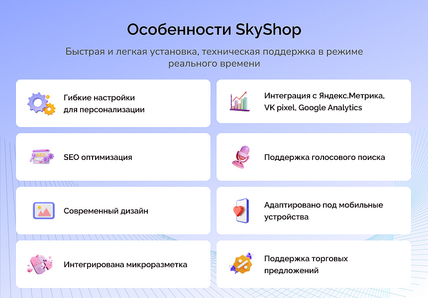 SkyShop — это интернет-магазин, отличающийся быстротой и лёгкостью настройки. Наша команда разработала мощный функционал для развития бизнеса и сделала его простым и понятным.