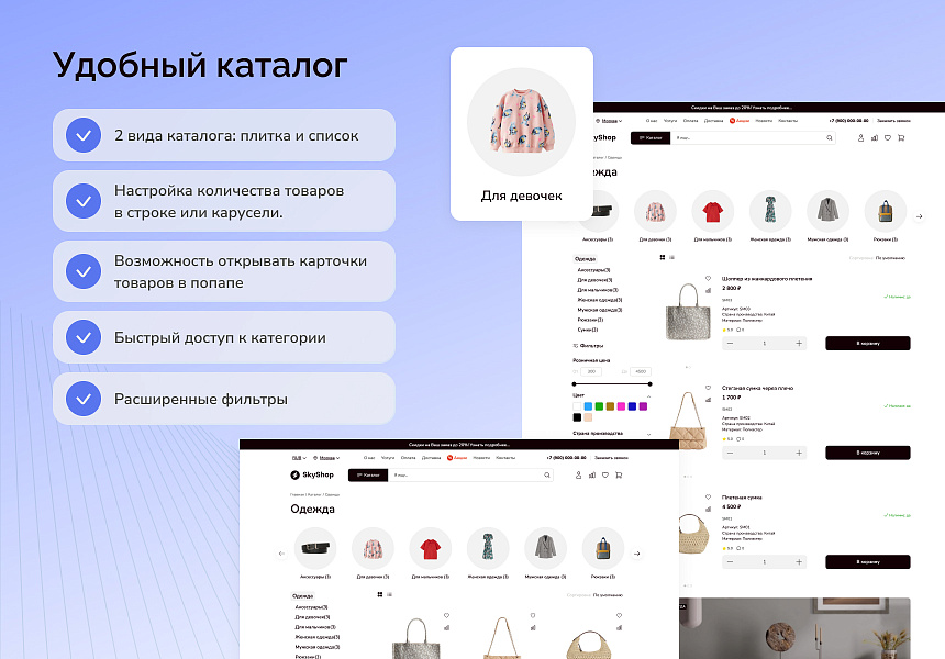 SkyShop обеспечивает идеальное отображение на любых устройствах, предлагая отдельные настройки для мобильных версий.