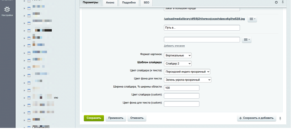 Настройки ширины: Ширина области слайдера задается в процентах, по умолчанию — 100%. Это значение можно изменить в настройках свойств Инфоблока, позволяя вам настроить слайдер под любые требования.