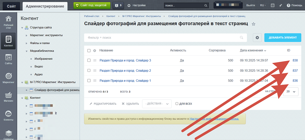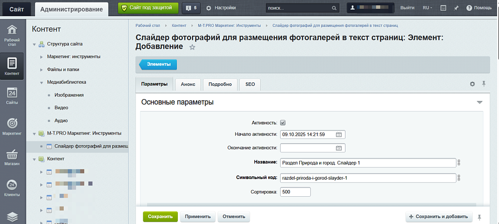 Удобство работы: Слайдер фотографий интегрирован с Инфоблоком, позволяя добавлять сразу несколько фотографий. Это существенно упрощает процесс, поскольку вам больше не нужно создавать множество отдельных элементов для одного слайдера. Всё организовано просто и удобно.