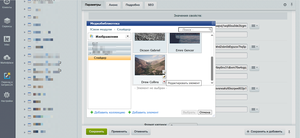 Настройки в режиме правки: Вы можете менять шаблон слайдера и другие настройки в публичной части сайта. Просто наведите на область слайдера и выберите опцию «Изменить элемент».