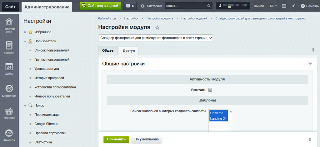 Гибкость размещения: Каждый элемент Инфоблока является самостоятельным слайдером, который можно использовать в различных частях сайта: в товарах, новостях, описаниях разделов или на статичных страницах. Это обеспечивает большую гибкость в адаптации контента.