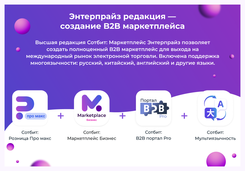 - Битрикс. На выбор доступно несколько лицензий 1С-Битрикс, на которых может работать Сотбит: Маркетплейс Старт – личный кабинет поставщика: Бизнес, Корпоративный портал, Энтерпрайз, Интернет-магазин + CRM. Подходящая выбирается в соответствии с вашими требованиями к новому сервису и особенностями самого бизнеса.