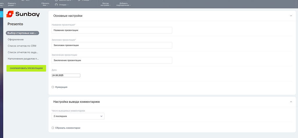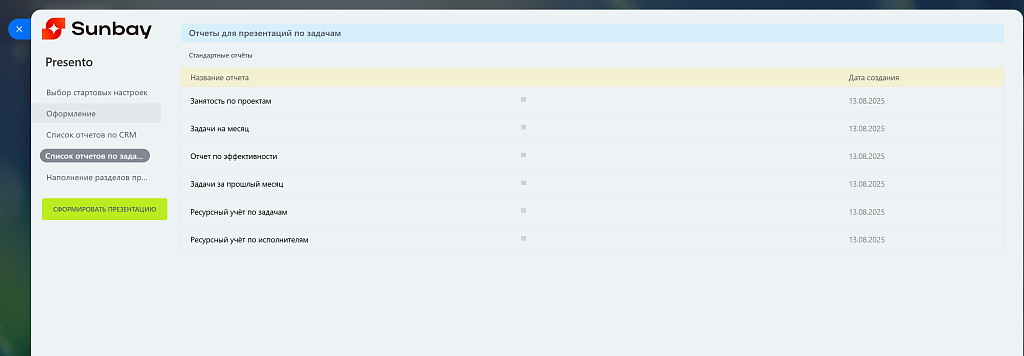 Что такое Sunbay Presento?Sunbay Presento — это модуль для автоматического создания презентаций в формате PowerPoint, основанный на данных из Битрикс24. Просто выберите нужные отчёты — и система мгновенно сформирует красивую, структурированную презентацию с актуальными данными, диаграммами и пояснениями.