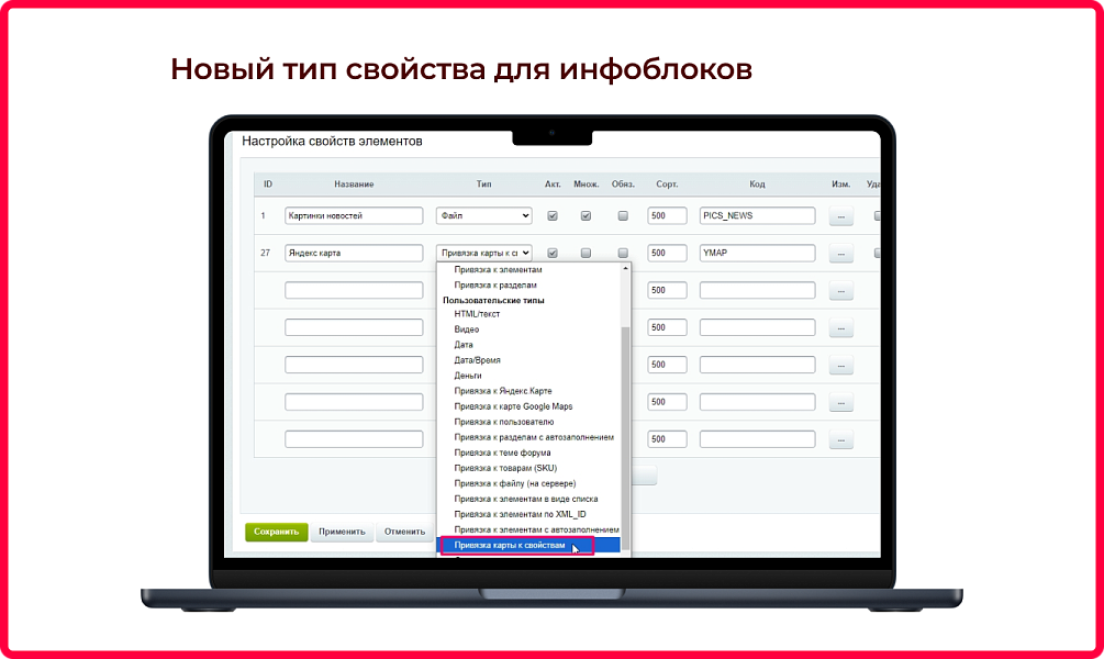 После установки модуля в настройках инфоблока станет доступен новый тип свойств элементов инфоблока “Привязка карты к свойствам”.