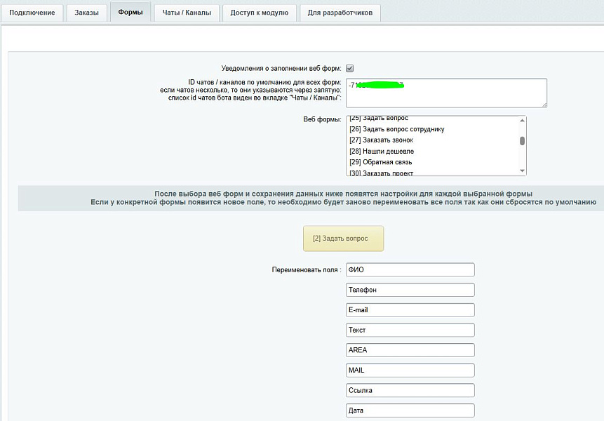 Гибкая настройка дает возможность как отправлять все уведомления в один канал, так и распределить каждую отдельную веб-форму на отдельного получателя. Это полезно для распределения уведомлений по соответствующим отделам компании.