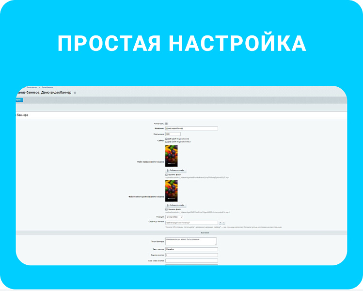 - Управление несколькими видеобанерами: активность, сортировка.