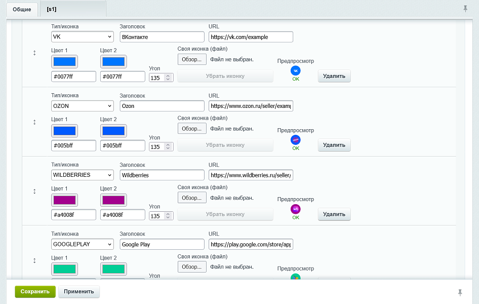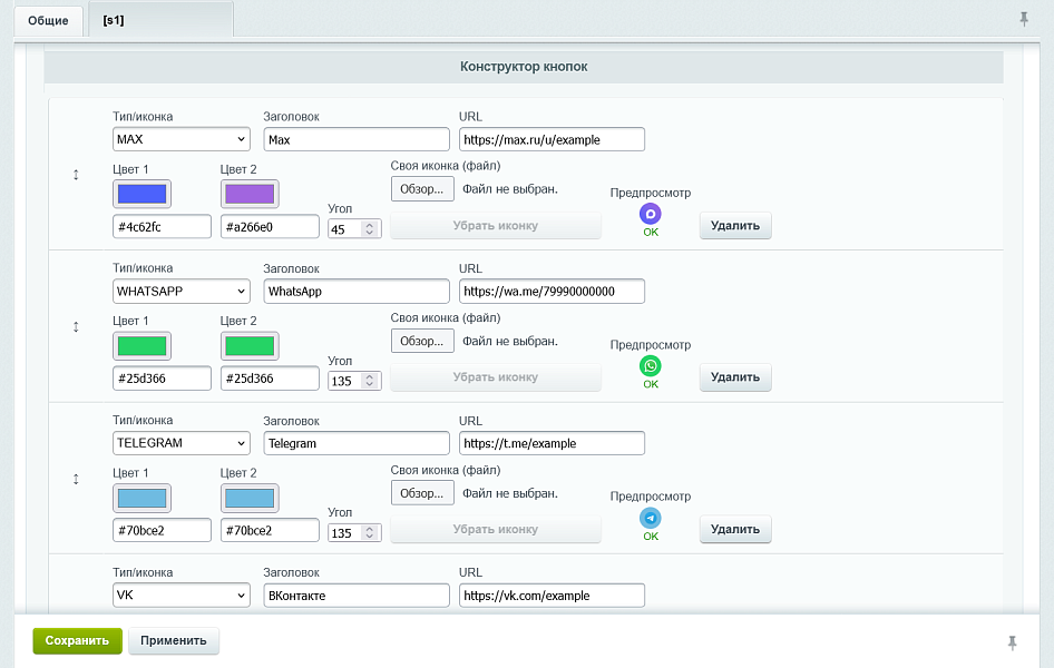 Модуль уже содержит набор популярных вариантов: Max, Telegram, WhatsApp, VK (ВКонтакте), OK (Одноклассники), Viber, WeChat, TikTok, X (Twitter), Pinterest, Twitch, Snapchat, Vimeo, YouTube, RuTube, Ozon, Wildberries, Яндекс Маркет, Мегамаркет, Google Play, RuStore, Microsoft Store, App Store (Apple), AliExpress, Телефон, E-mail, JivoChat, TenChat, Habr (Хабр), VC, Дзен.
