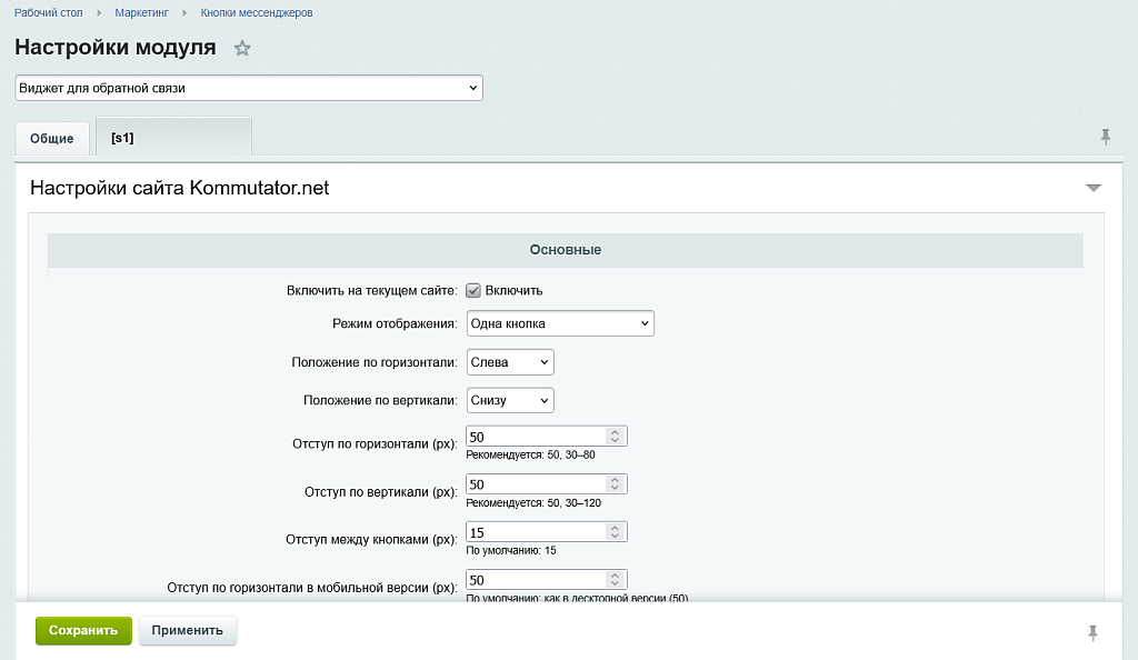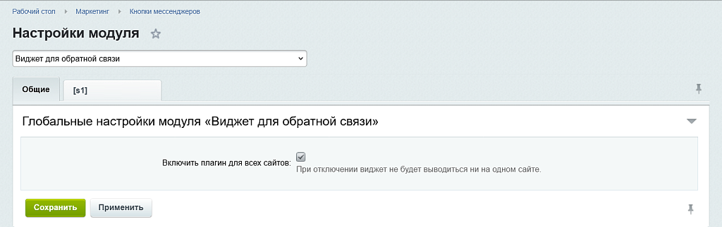 Раздел «Настройки → Настройки продукта → Настройки модулей → Виджет для обратной связи».