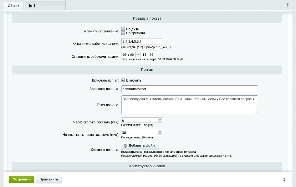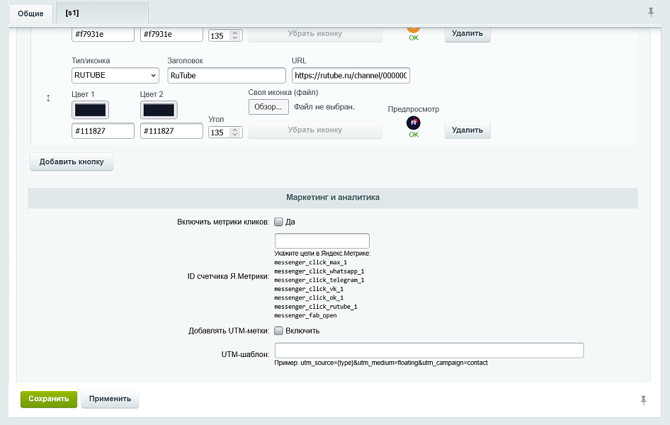 Раздел «Маркетинг → Кнопки мессенджеров».