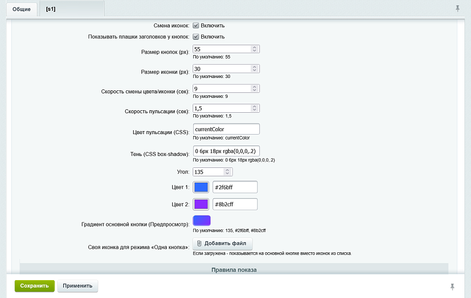 - Настройка расположения виджета на экране, отступов, размеров кнопок и иконок.
