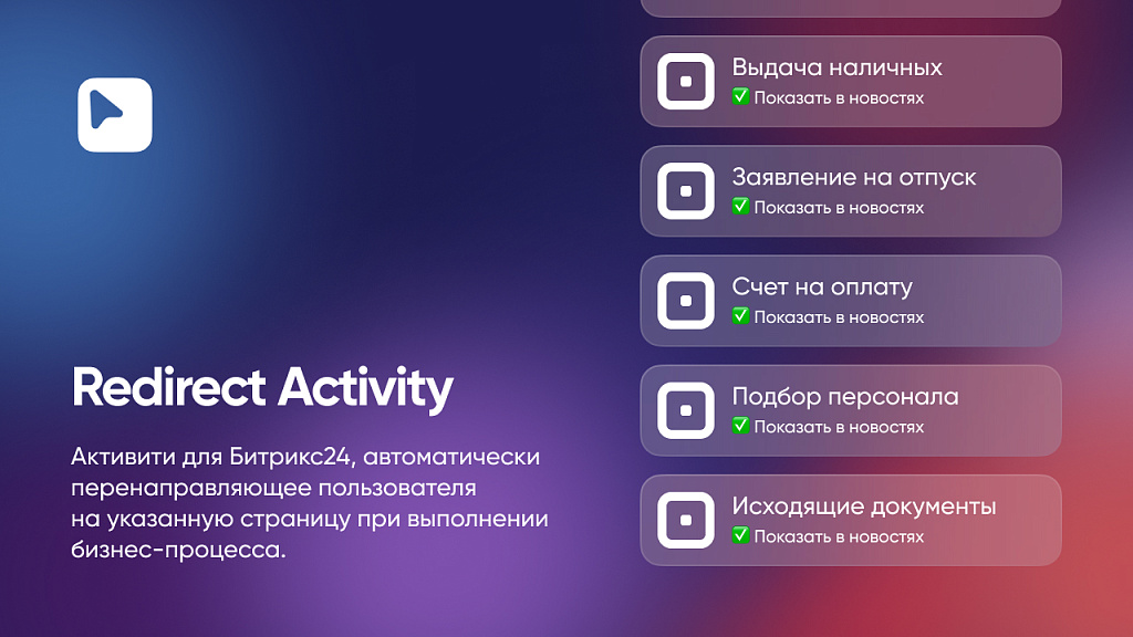 Redirect Activity — это дополнительное активити для редактора бизнес-процессов Битрикс24, которое позволяет автоматически перенаправлять пользователя на указанную страницу портала или внешний веб-ресурс в момент выполнения бизнес-процесса.