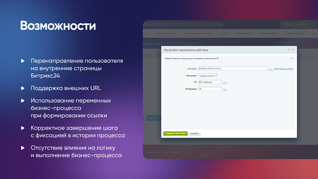Решение используется в тех сценариях, когда по логике процесса сотруднику необходимо перейти к конкретному элементу портала: карточке CRM, задаче, рабочей группе, отчету или внешнему сервису. Перенаправление выполняется без прерывания или остановки бизнес-процесса и фиксируется в его истории.