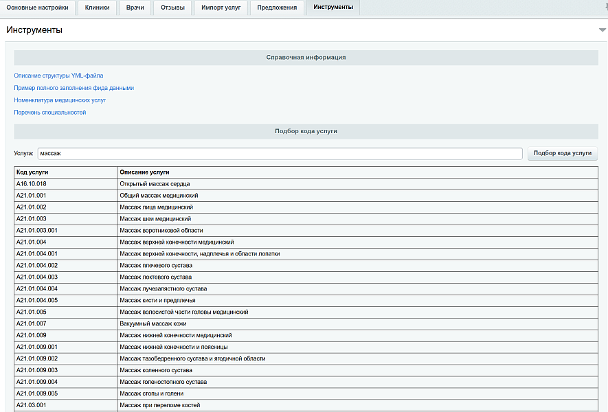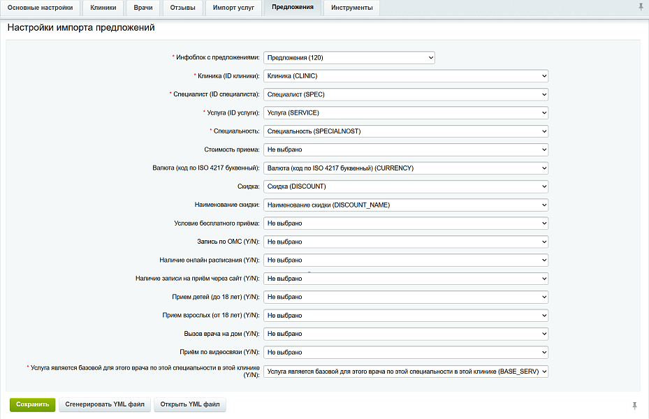 • Гибкая настройка: Вы можете использовать как уже существующие на вашем сайте инфоблоки с информацией о врачах, клиниках и услугах, так и создать их автоматически с помощью модуля. Предусмотрена гибкая настройка соответствия полей инфоблоков и тегов YML-фида.