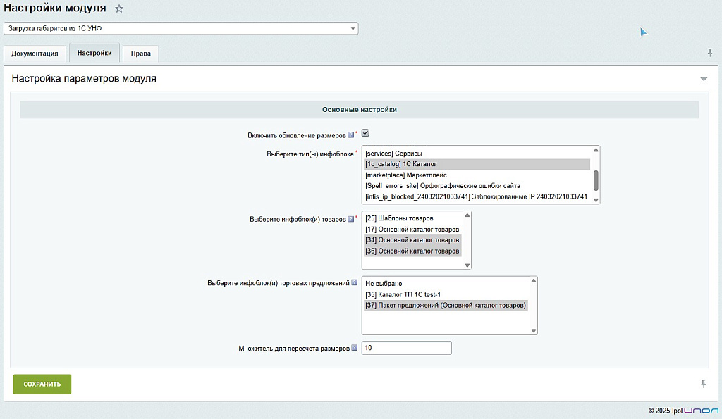 Только для УНФ: при выгрузке реквизитов из 1С УНФ модуль добавляет габариты в каталог товаров.